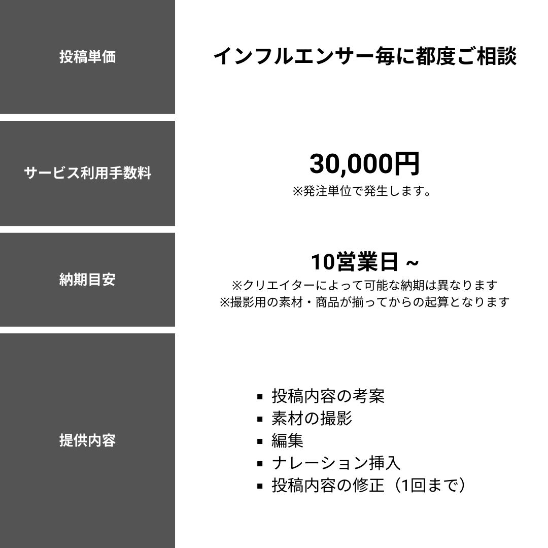 縦型ショート動画に特化したクリエイターマッチングサービスです。InstagramやTiTokなど、SNSでショート動画を伸ばした実績のあるインフルエンサーやクリエイターに、低コストかつ手軽に動画制作やPR投稿を依頼することができます。