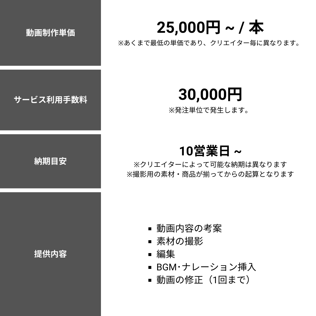 依頼方法は所定のフォームに案件情報とリクエスト内容を記載するだけ。構成の考案、撮影、編集までをクリエイターにまるっとお任せしたうえで、他社サービスと比べてもスピーディーな納品が可能です。
